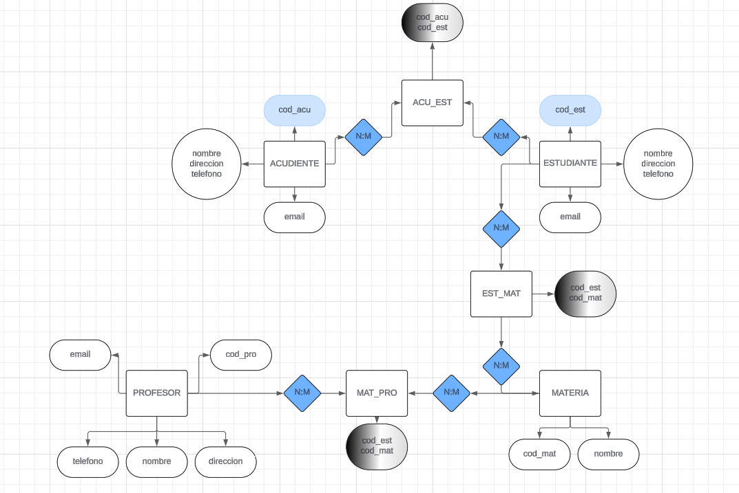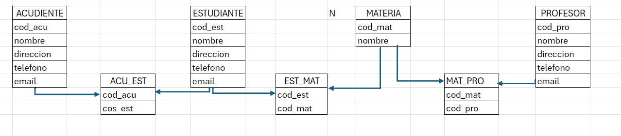 Una escuela de básica secundaria desea sistematizar el proceso interno del manejo de la matrícula, para lo cual requiere que se le construya una BD que permita almacenar del estudiante(código, nombre, dirección, teléfono, acudiente, email) tenga presente que un acudiente puede representar varios estudiantes.